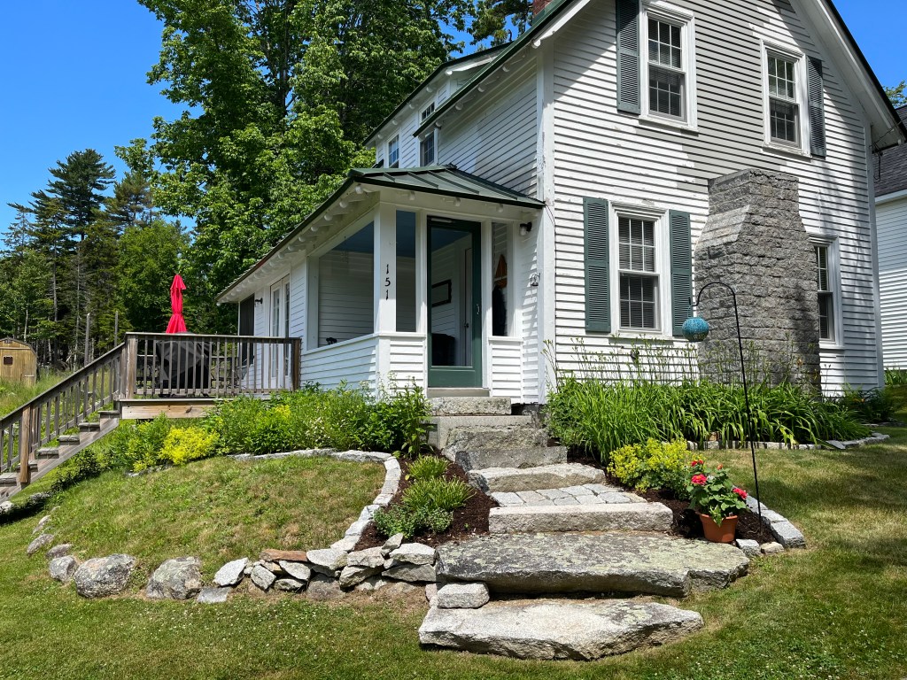 Lastly, we present Wood’s Point. With it’s own private beach, this house sits on Blue Hill Bay and provides glorious, stunningly beautiful southerly views. With three bedrooms and 2 1/2 baths, guests enjoy both sunrises and sunsets, and have easy access to the private beach. The layout is spacious and open and includes the primary king bedroom and en suite, and the second floor has two bedrooms with a queen and two twins and full bath. Relax on the deck overlooking the ocean and views of Long Island, Newberry Neck, Darlings Island and Cadillac Mountain, or relax in the peaceful and comfortable screened-in porch.